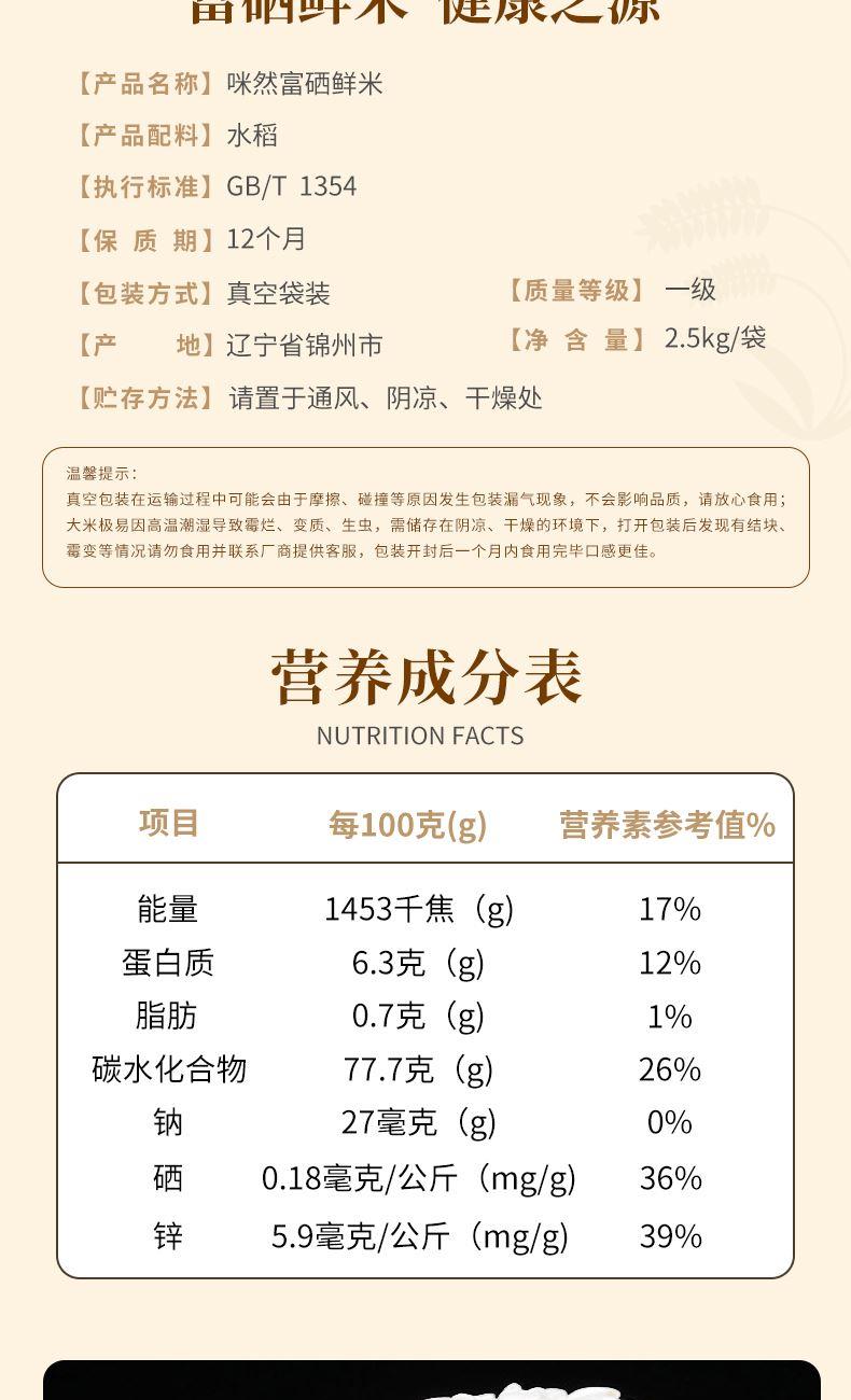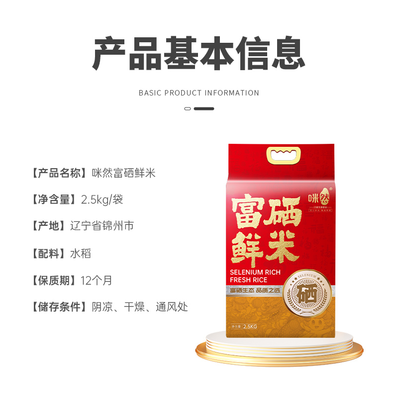 產 品 : 咪然富硒鮮米2.5kg 執(zhí)行標準 : GB/T 1354 保 質 期 :12個月 產 地 :遼寧錦州 箱 規(guī) :8*2.5kg