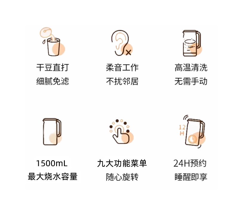 4、干豆直打,免過(guò)濾,24h預(yù)約,柔音工作,不擾人