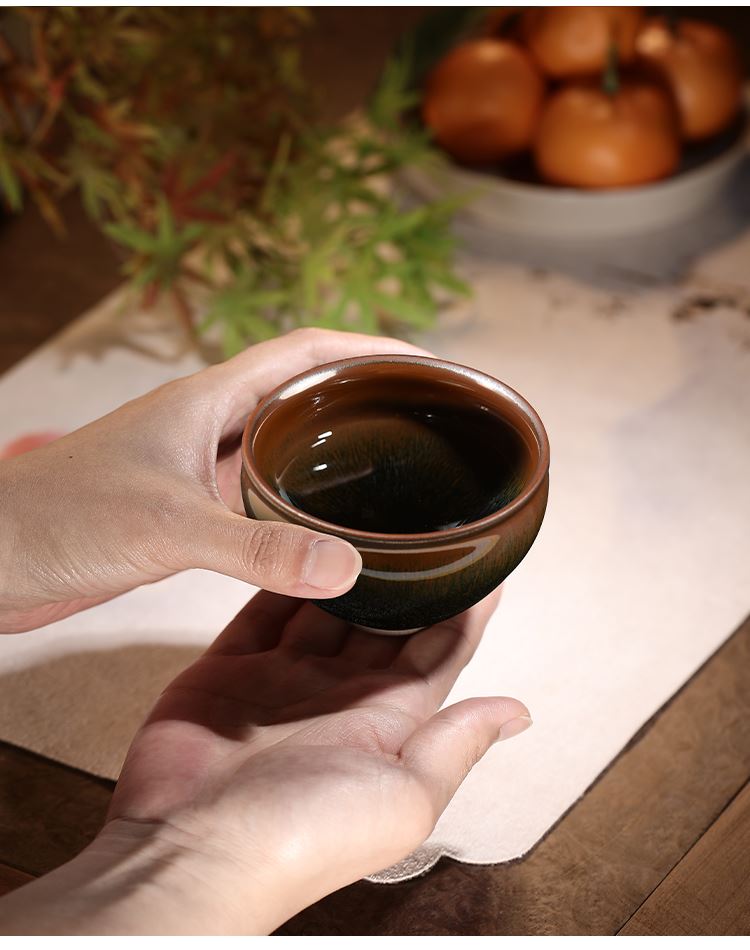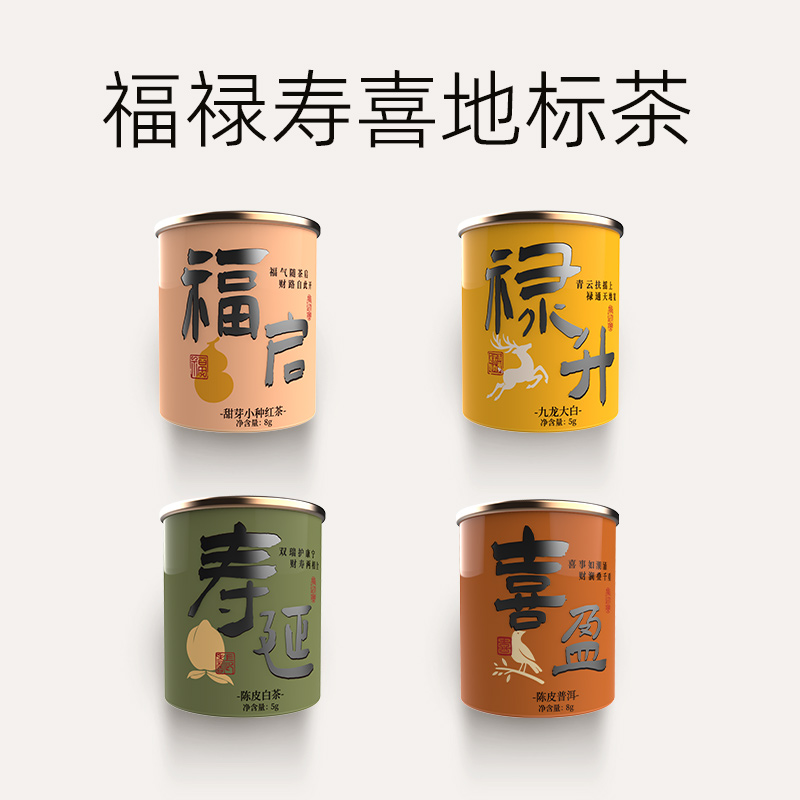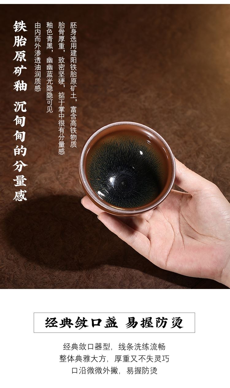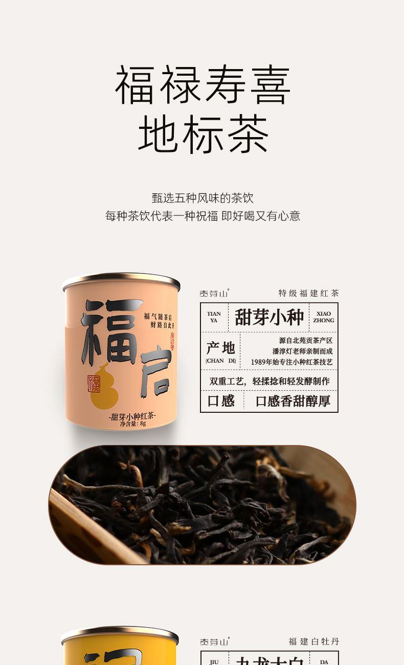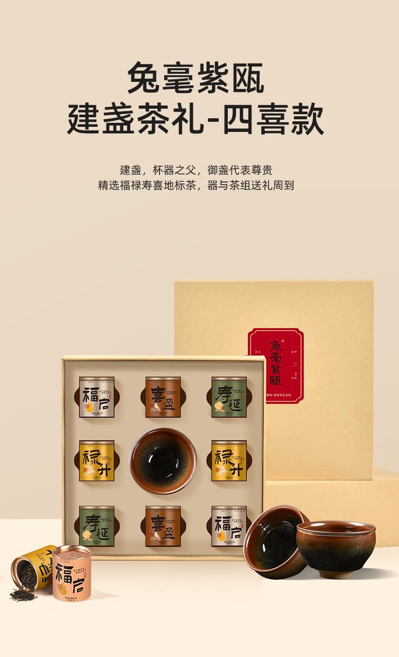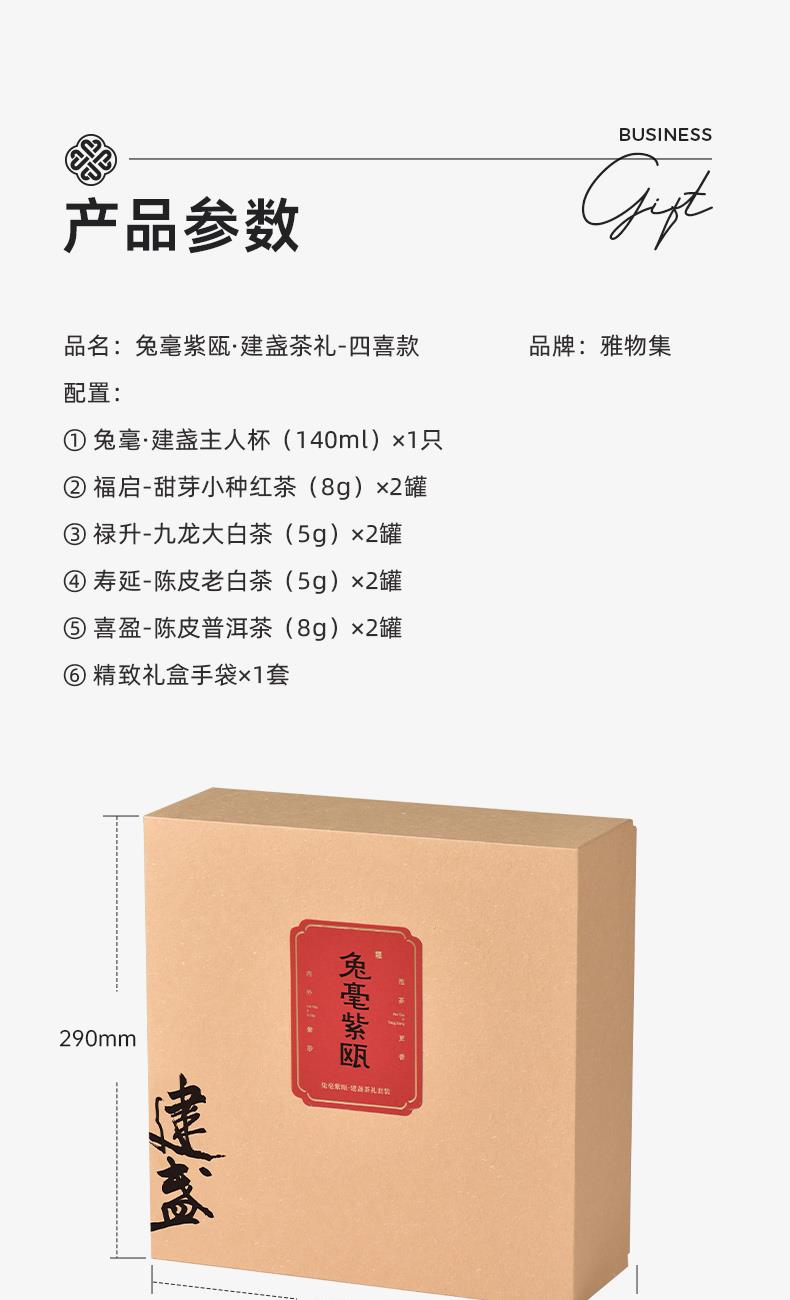 配置 · ① 兔毫·建盞主人杯(140ml)×1只 ② 福啟-甜芽小種紅茶(8g)×2罐 ③ 祿升-九龍大白茶(5g)×2罐 ④ 壽延-陳皮老白茶(5g)×2罐 ⑤ 喜盈-陳皮普洱茶(8g)×2罐 ⑥ 精致禮盒手袋×1套